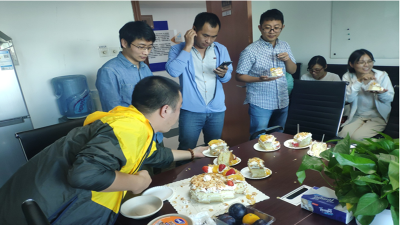 下午3点,公司同事们准时来到会议室,此时为大家精心准备的蛋糕已经放在了会议室的桌子上,还有零食架上丰富可口的零食饮料也等待着大家的享用。