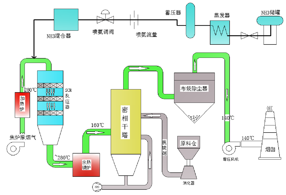 焦炉烟气→加热炉系统→ SCR 脱硝系统→余热锅炉系统→半干法脱硫系统→引风机→烟囱