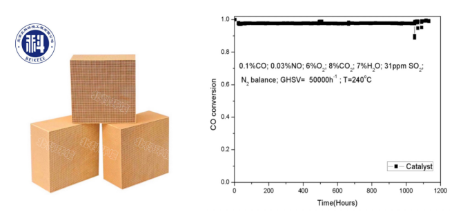 从应用的角度,催化剂的耐硫稳定性问题是催化剂在烟气治理领域的一块短板,北科环境研发团队进行了耐硫燃烧催化剂的开发,完成了 1000 小时以上耐硫性能测试。在高 SO2 和水蒸气含量下,催化剂效率仍稳定在95%以上,完全可以满足工业应用需求。