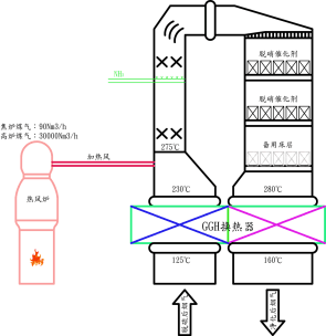 一氧化碳燃烧反应为放热过程,根据反应热力学参数进行计算,8000mg/Nm3的CO 完全氧化生成 CO2 所释放能量为80 .8kJ/Nm3(1molCO完全转化释放热能282.98 kJ/mol)。根据烟气组成计算,烟气密度为:ρ=1.328 kg/Nm³,烟气比热容:C=998 J/(kg·℃),尾气温升(理论计算)约60℃。通过换热器,将催化反应释放的热能提供给脱硫后的烟气,达到脱硝反应所需温度,节省能耗成本4.00~5.32元/吨矿。