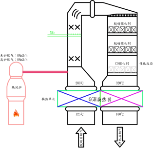 烧结烟气主要成分为:N2、O2、CO2、CO,烟气中CO浓度为6000~10000 mg/Nm3。CO在催化剂的作用下,实现低温条件下将CO氧化为CO2,同时反应释放大量热能。反应产生的热能通过换热器提供给脱硫净化后的烟气,实现了脱硫烟气升温,达到脱硝SCR反应所需的温度,不再需要热风炉补热,降低了能源消耗。