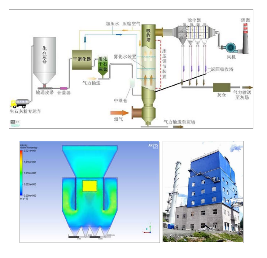 在密相塔内部脱硫工艺参数条件下,少部分大粒径颗粒落入脱硫塔灰斗内,通过脱硫塔灰斗底部设置的喷射器输送的循环灰直接送入至脱硫塔内继续参与脱硫反应,使脱硫灰中的有效成分得以循环利用。净化后的烟气由引风机送至烟囱达标排放。新料采用生石灰石或消石灰石,在脱硫装置侧加入。