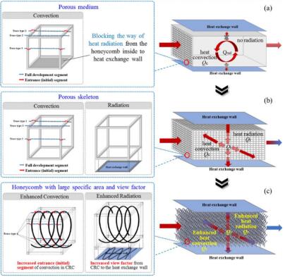 2)通过对流和辐射的耦合实现连续换热。常规的蓄热式换热器相当于是格子砖,虽然比表面积能达到700~800/m³,但它的传热过程以对流为主,因为格子砖周围都是墙壁,进去的热量不能通过辐射的形式传给换热壁面,而是被锁在墙壁里面,只能通过对流的方式来进行换热。而三维蜂巢蓄换热器是具有三维通孔的金属蜂巢结构,它在三个方向都有很大的换热面,从而具有超高的比表面积。烟气和蜂巢之间先进行很强的对流换热,蜂巢吸收到高温烟气的热量之后又通过三维通孔以辐射的形式把这个热量马上辐射到了换热表面上去。所以通过对流和辐射的偶合就可以实现高效的烟气余热回收。