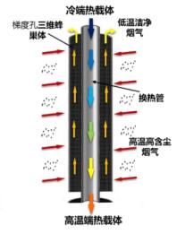实验室研究成果:要回收高温烟气的余热,如果冷却介质用的是气体介质,换热管内外都加三维蜂巢,蜂巢相当于是一个强化气体侧传热的元件,如果用水或者是用其他液体作为冷却介质,换热管里面就不用加三维蜂巢,只需在气体测加三维蜂巢。实验结果发现这种集成的管件(如图三所示)跟普通光管相比,三维蜂巢管件烟气出口温度成反指数急剧下降,出口温度可急剧下降到100℃以下,比常规光管的换热能力强化了5~8倍左右。对于除尘效果来说,出口的粉尘浓度可以降到10mg/m³以下,达到超低排放的标准,粉尘的净化效率高达99%以上。三维蜂巢管件的压降大概是在3000帕左右。
