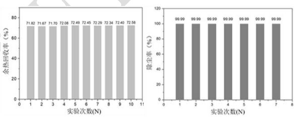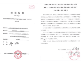 第三方测试的实验成果:入口的烟气温度平均800.7℃,烟气含尘浓度约2086~12459mg每立方米。经过三维蜂巢除尘换热之后,出口烟气的粉尘浓度降到30mg以下,约 5~27mg/m³,余热回收效率是72%,粉尘净化率是99%