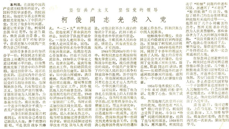 在柯俊先生身上,集中体现了老一辈科学家爱党爱国的报国情怀、实事求是的治学精神、敢为人先的创新品格。作为后辈的我们,当以先生为榜样,励志奋斗,为中华民族伟大复兴贡献自己的力量!