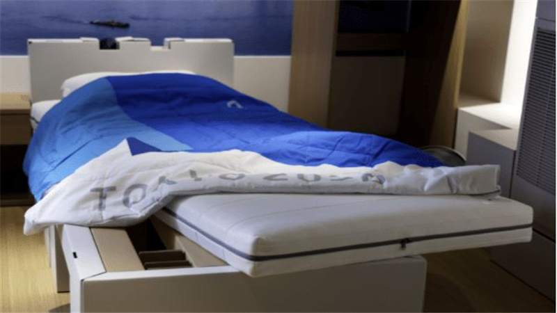 这些床都是由再生材料制成的,拼在一起像一个个“纸盒子”,这在奥运会历史上还是首次。